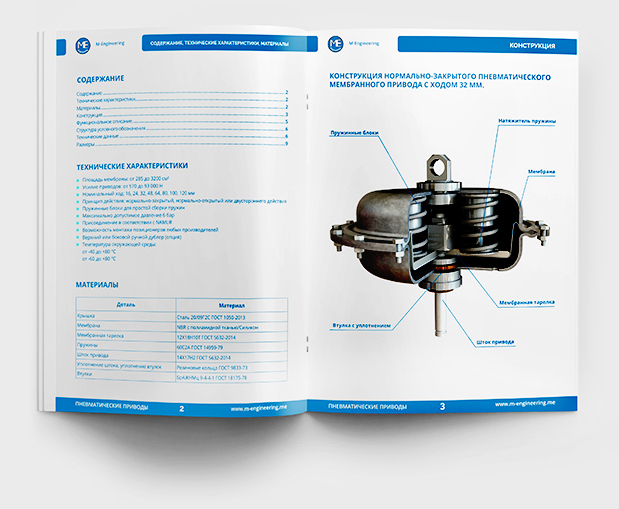 Оцинкованные пружины. Мембрана не взаимодействует с окружающей средой (полностью закрыта). Все внутренние детали изготовлены из нержавеющей стали. Бронзовая направляющая втулка. Грязесъемник предотвращает попадания грязи внутрь привода. Буртик мембраны герметизирует шток. Штампованные крышки изготавливаются из низкотемпературной углеродистой стали (возможно изготовление из нержавеющей стали). Уникальная конструкция мембраны - без отверстий под болты по окружности.